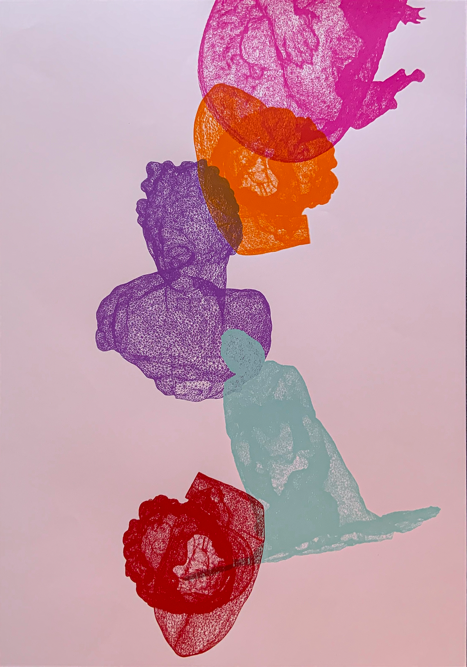 In my practice I like to challenge existing dichotomies --between "hand-made" and "artificial", "analogue" and "digital". This entails navigating the intriguing duality of engaging with VR technologies on one hand and embracing hand printing techniques like screen printing on the other. Layering 3d scans with my own drawings I create intricate screenprints, allowing layers of ink to built up. Some of the prints have up to twelve layers of ink built up, with the transparent layers allowing to show what is underneath.